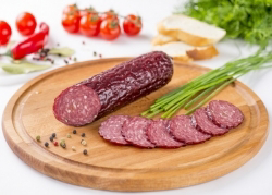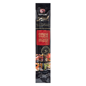 Beef Salami "Servelat Kavkaz Germes" Netto: 280g. Ingredients: 100g Servelat are made from 125g beef. Beef 110%; Water; Saline; Preservative: sodium nitrite; spices; Stabilizer: diphosphates; Acidifier: sodium acetates, sodium citrates; Flavor enhancer: Mononatriumglutomat; dextrose; Smoke. May contain traces of EGG, LACTOSE, CELERY, MUSTARD, SOY and PEANUTS. Keep at +7C. Country of origin: Germany. Nutritional value per 100g: Energy-638kJ/152kcal , Fat-7.8g, of which saturates-3.1g, Carbohydrates-1.0g, of which sugars-1.0g, Protein-20g, Salt-2.2g
