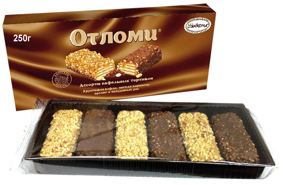 Mix of portioned glazed and unglazed waffle cakes with cream filling, sprinkled with peanut nibs and puffed rice.