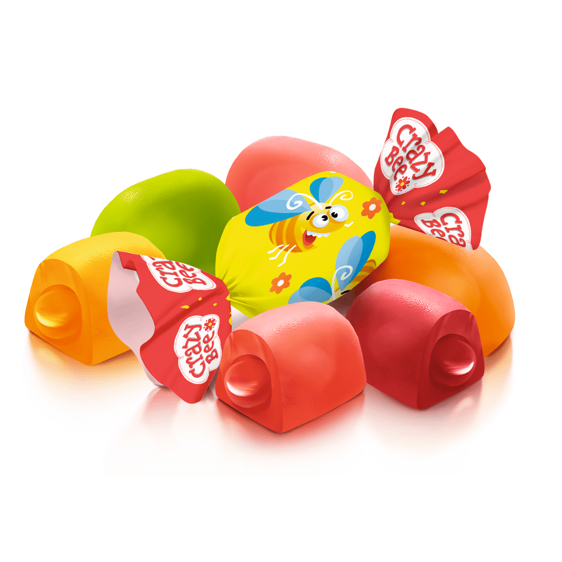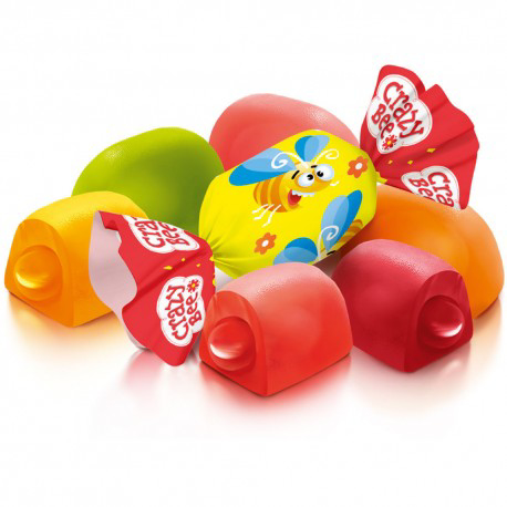 Roshen Crazy Bee Fruity Jelly Candies with natural juices fillings. Assorted flavors include sour cherry, orange, wild strawberry, lemon-lime, pink grapefruit, and cranberry.