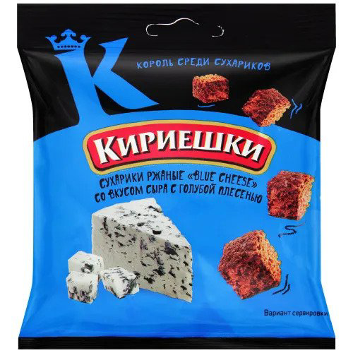 Spicy rye crackers with the taste of gourmet blue cheese."Kirieshki" are made from freshly baked bread, without deep-frying.Modern technology preserves the beneficial properties of cereals and provides croutons with an unforgettable taste.Crackers are a universal product. They make a hearty snack, as well as a great addition to foamy drinks. "Kirieshki" can be taken on the road, or you can use it in cooking - add it to soups and salads.– Try adding blue cheese croutons to a cheese salad with pickles. In addition to the main products, for it you will also need a boiled egg, some garlic and black pepper, fresh herbs and mayonnaise. Serve the salad immediately so that the croutons do not get soggy.