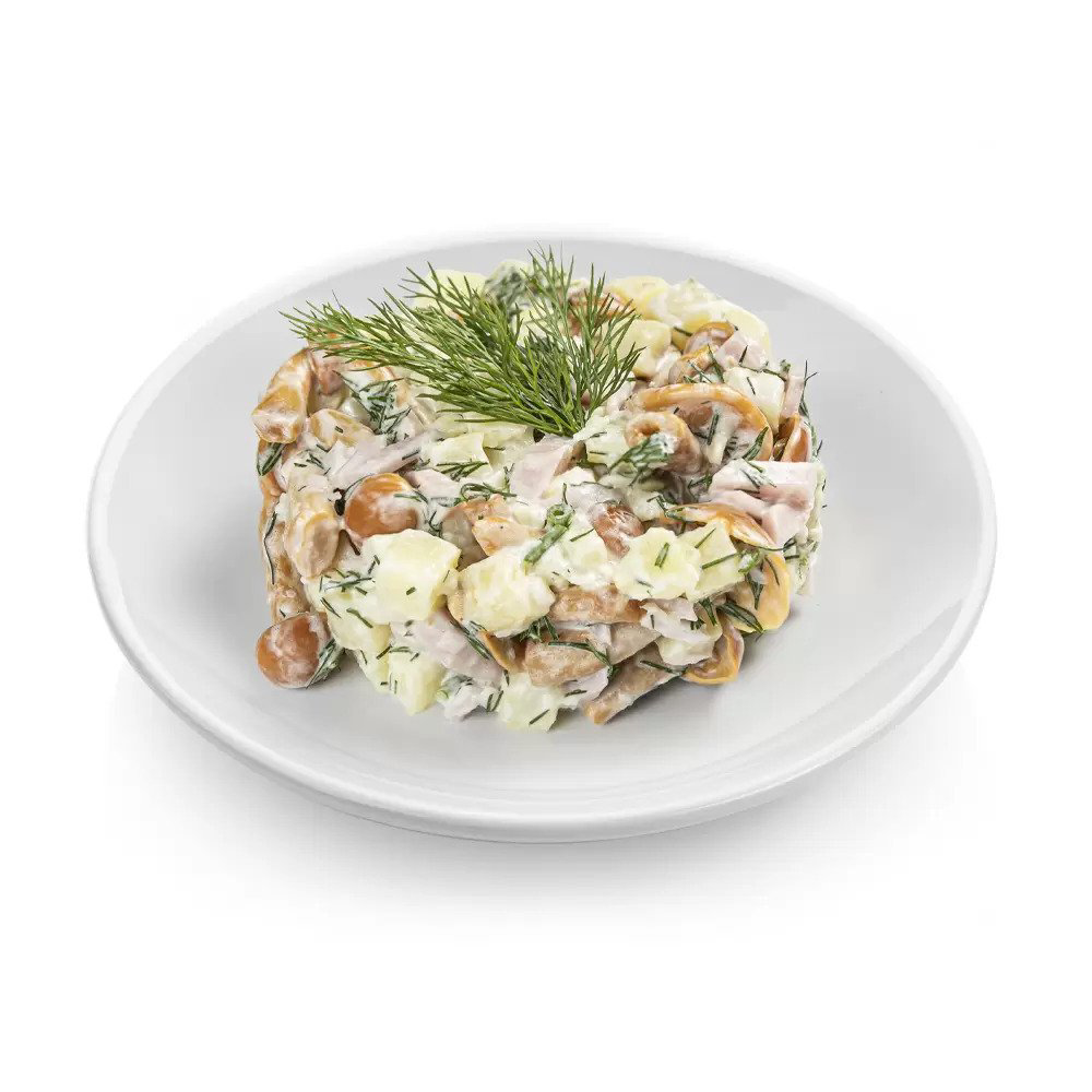 A multi-component salad that perfectly combines boiled potatoes, ham, juicy onions and pickled mushrooms, mayo, giving the dish a bright piquant taste. A real find for those who love hearty and winter salads, but want to try something new.