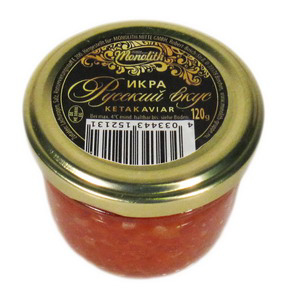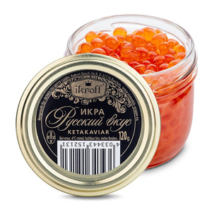 Chum salmon caviar in the glass jar of 120g - shiny eggs, delicate aroma and smooth taste. Many experts of caviar say that this variety is the most desirable.