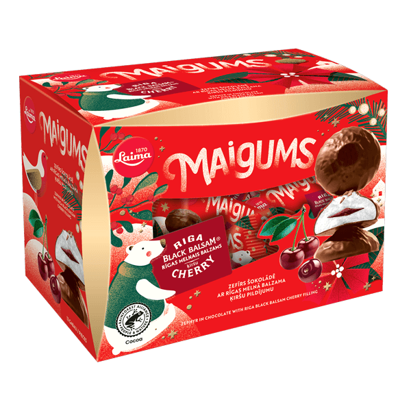 During the holidays, we want to give the best to our loved ones and loved ones, delight them with various surprises and make Christmas unforgettable. Show how you took care of the delicious marshmallow Maigums, which this year has been given an original, modern and unique taste bouquet. The softness of marshmallow in chocolate with Riga Black Balsam Cherry filling is matched to this, the brightest and most heartfelt holiday of the year. Enjoy Tenderness with people who mean so much to you ...