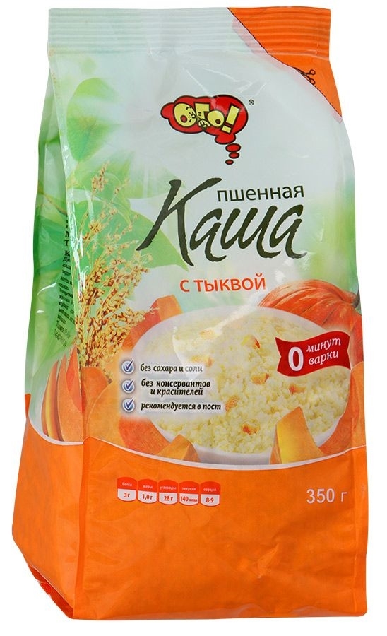 Porridge millet with pumpkin, 350g.Does not require cooking. Without sugar and salt. Without preservatives and colorants. Recommended infast.Ingredients: millet flakes, slices of dried pumpkin.The product may contain a small amount of nuts, peanuts and milk.Nutritional value per 100g: proteins 8g, fats 2.5g, carbohydrates 71g.The energy value is 340kcal.