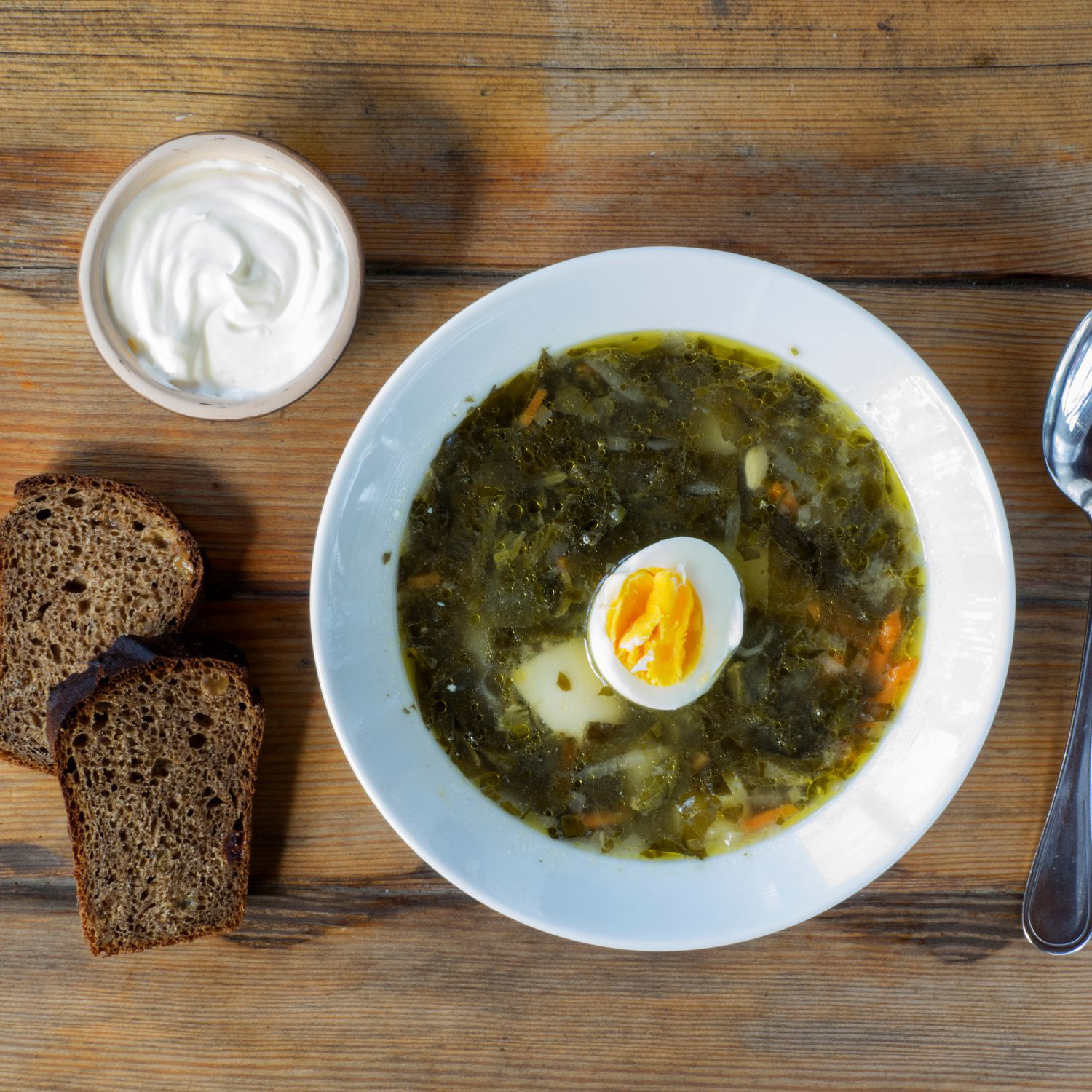 Ingredients: sorrel, potatoes, carrots, onions, rice, olive oil, salt/pepper, egg, sour cream.