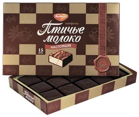 Candy "Bird's Milk" in the gift box - the same, familiar with childhood taste. Dense rows of dark chocolate covered icing squares. Under her brittle smoothness is a delicate creamy vanilla souffle, reminiscent of the taste of a filling. A box with a traditional beige-brown checkered pattern. A truly rich gift that can delight the most experienced slasten.