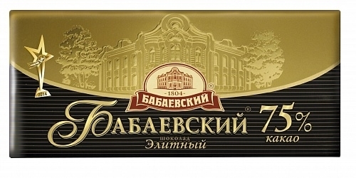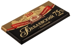 Elite bitter chocolate "Babaevsky" with 75% content of cocoa products. This bitter chocolate with a bright aroma of cocoa beans, traditional bitterness in taste and deep multifaceted shades. Traditional packaging with golden embossing can be an excellent gift for any occasion. This chocolate for real connoisseurs.
