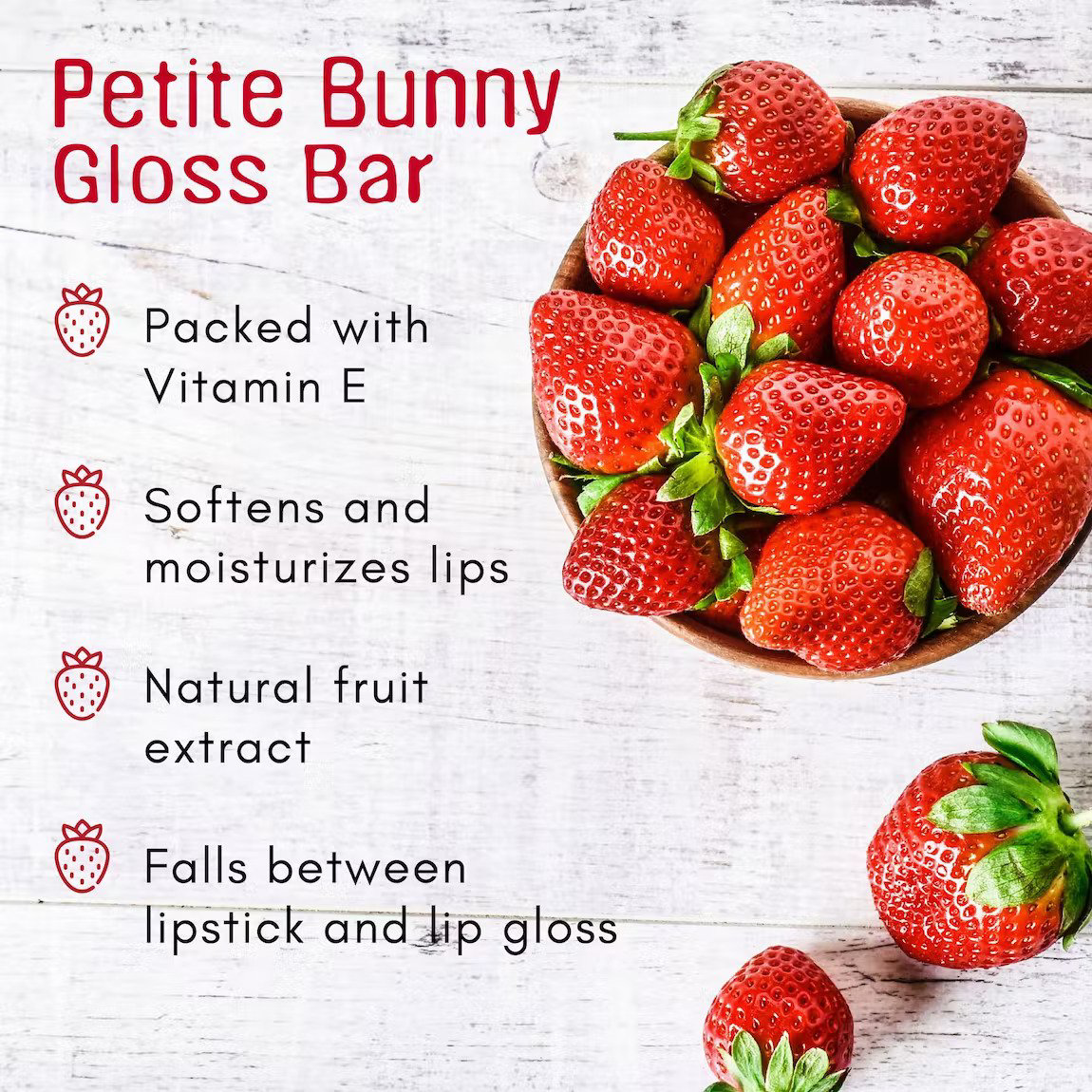 As brilliant as they are covetable, TONYMOLY’s Petite Bunny glossbars each have a different expression – should you need yet anotherexcuse to collect every one… quirkily cool, these are guaranteed todelight all the girls in your life – irrespective of age – thanksto their serious, South Korean skincare ingredients and not-so-seriousexteriors. With a smooth texture that falls somewhere between lipstickand lip gloss, this adorable lip crayon is packed with Vitamin E tosoften and moisturize lips. Each gloss bar has a different fruityscent and shade, giving lips a natural, sheer colour with a high shineglossy finish. This seriously adorable gloss bar can be worn alone orover a tint to add a little extra shine!HOW TO USE: Twist bottom section to extract product and apply directlyonto lips. Use alone or blend on top of a stain or tint. INGREDIENTS: JUICY CHERRY Polyglyceryl-2 TriisostearateTriethylhexanoin Diisostearyl Malate Caprylic/Capric TriglycerideDiglyceryl Sebacate/Isopalmitate Ozokerite Ceresin PhytosterylIsostearyl Dimer Dilinoleate Polyethylene GlycerylEthylhexanoate/Stearate/Adipate DipentaerythritylHexahydroxystearate/Hexastearate/Hexarosinate VP/Hexadecene CopolymerSorbitan Isostearate Hydrogenated Castor Oil Isostearate Synthetic WaxDicalcium Phosphate Titanium Dioxide (CI 77891) Ethylene/PropyleneCopolymer Yellow 5 Lake (CI 19140) Red 7 (CI 15850:1) Polyglyceryl-2Diisostearate Red 28 Lake (CI 45410) Fragrance(Parfum) MethylparabenRed 6 (CI 15850) Ascorbyl Tetraisopalmitate Tocopheryl Acetate WaterButylene Glycol Vaccinium Macrocarpon (Cranberry) Fruit ExtractFragaria Chiloensis (Strawberry) Fruit Extract Rubus Idaeus(Raspberry) Fruit Extract Vaccinium Angustifolium (Blueberry) FruitExtract Rubus Fruticosus (Blackberry) Fruit Extract