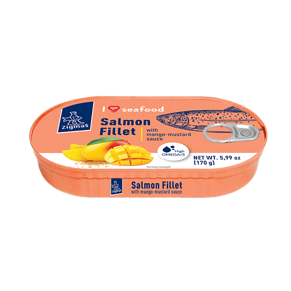 We present you ‘I love seafood’ canned salmon fillets This is an excellent choice for eating at home and for traveling as the product has no temperature regime. Salmon is rich in omega 3 fatty acids which are important for our body. For a quick and easy snack, we recommend to eat this canned fish product with bread or another garnish.