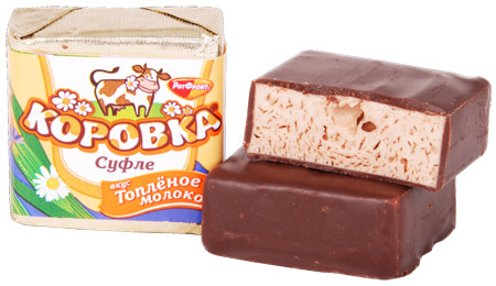 Конфеты квадратной формы – шоколадные с начинкой из воздушного суфле со вкусом топлёного молока кофейного цвета. Каждая конфетка обернута в фольгу и яркую бумажную обертку. Эти конфеты обязательно придутся по вкусу и взрослым, и детям.