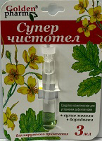 Косметическая жидкость для быстрого избавления от бородавок и папиллом. Эффективно воздействует на ороговевшие участки кожи. Перед применением внимательно ознакомьтесь с инструкцией (щёлочь).