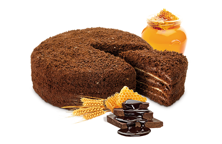 Ingredients: WHEAT flour (20%), thickened sweetened full-fat MILK with cocoa 21% ( MILK , sugar, cocoa powder with reduced fat content 7.2%), sour cream ( CREAM , potato starch, MILK culture), sugar (powdered sugar, anti-caking agents: potato starch), mixed spreadable fat [vegetable fats and oils (palm, rapeseed, sunflower, coconut completely solidified, coconut; in various proportions by weight), BUTTER , water, YOGURT (0.1% fat), BUTTER, emulsifiers (mono- and diglycerides of fatty acids from edible fats, polyglycerol esters with edible fatty acids), preservative: potassium sorbate, coloring: beta carotene], pasteurized EGG melange, margarine [vegetable fats and oils not solidified (coconut, rapeseed, palm) , sunflower in a variable mass proportion) fully solidified vegetable fat (coconut), drinking water, emulsifiers (mono- and diglycerides of fatty acids from edible fat, polyglycerol esters with edible fatty acids), table salt (0.1%), acidity regulator: citric acid, aroma, color: beta-carotene], sugar, honey 2.3%, drinking water, cocoa powder with reduced fat content (2.1%), raising agent: E 500.