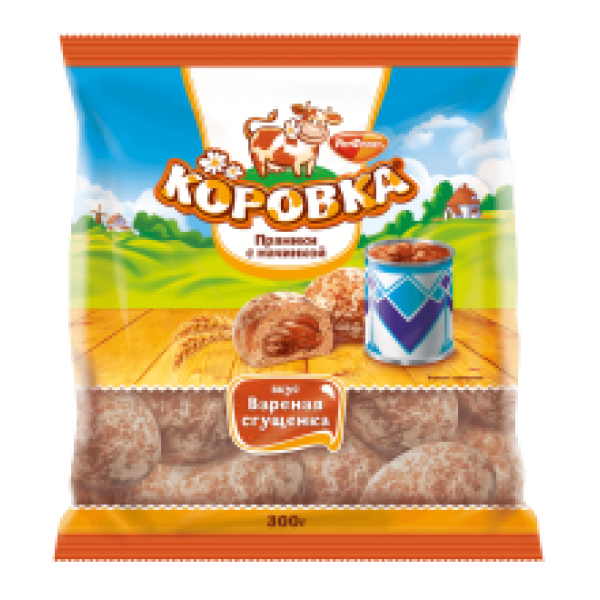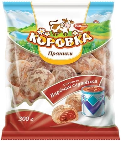 Пряники «Коровка» от фабрики «Рот Фронт» с начинкой из вареной сгущенки. Ароматные пряники из мягкого чуть тугого теста, щедро наполненные нежным кремом из вареной сгущенки и покрытые традиционной сахарной глазурью – прекрасное дополнение к горячему чаю! Удобная упаковка 300 г, чтобы каждый смог полакомиться душистыми пряниками «Коровка».