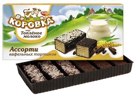 Ассорти тортиков «Коровка» от фабрики «Рот Фронт» – 6 мини-тортиков из хрустящих воздушных вафель, прослоенных ароматной молочной начинкой. Каждый покрыт нежной шоколадной глазурью и украшен двумя видами посыпки из светлой и темной шоколадной крошки. Нежное воздушное угощение с насыщенным сливочным ароматом и ярким вкусом.